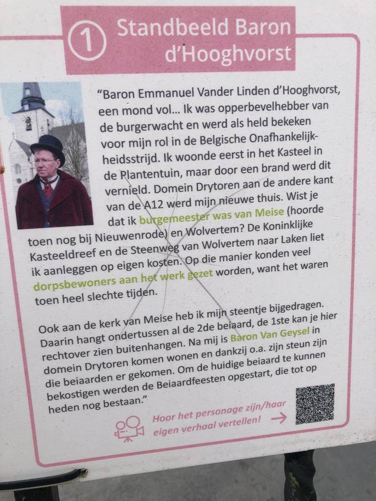 Baron d’Hooghvorst (1781-1866) was van 1807 tot 1866 burgemeester van Meise. Meer dan een halve eeuw dus. Hij was tevens burgemeester van Wolvertem van 1814 tot 1836. Dat alles eerst onder Frans en later onder Nederlands bewind. En tenslotte onder Belgisch bestuur. Een België waar hij mee aan de wieg van stond. Want als hoofd van de Burgerwacht was hij in 1830 lid van het Voorlopig Bewind dat de onafhankelijkheid van België uitriep en een ontwerp van grondwet opstelde. De baron woonde in het kasteel “Hof van Meysse” in het domein van Bouchout, een kasteel dat in 1945 door een brand is vernield (In de Plantentuin Meise vind je hierover een infobord).